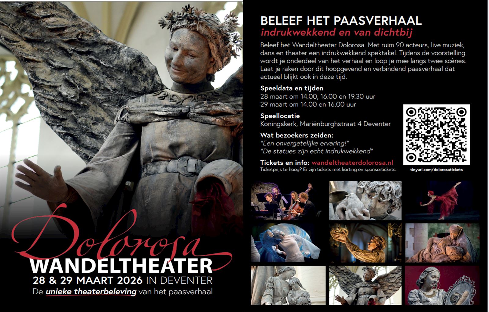 Wandeltheater Dolorosa geeft 5 voorstellingen op 28 en 29 maart 2026 in de Koningskerk aan de Mariënburghstraat 4 te Deventer.